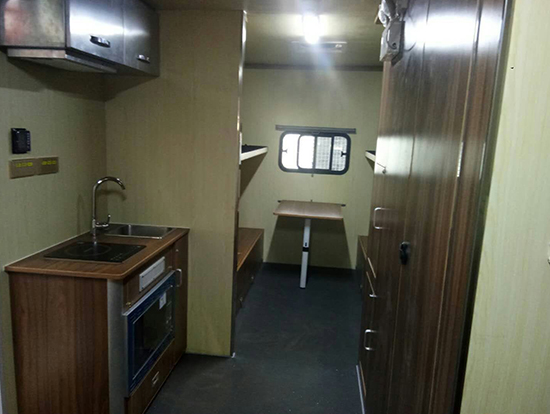 1、整個車體分成了廚房、休息區(qū)、洗浴區(qū)三個區(qū)域。