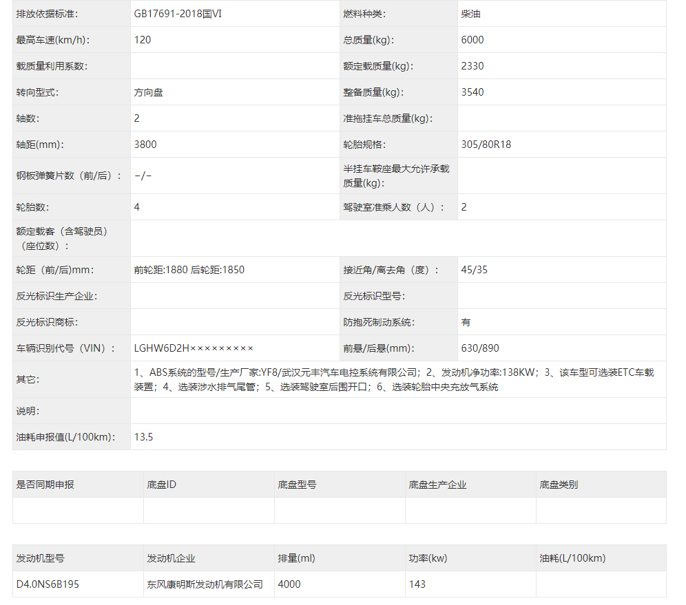 東風(fēng)猛士民用版EQ2063EYY6J型長頭單排四驅(qū)越野底盤是東風(fēng)越野車公司針對民用方面的首款軍轉(zhuǎn)民產(chǎn)品代表,其繼承東風(fēng)軍用猛士的正規(guī)血統(tǒng),品質(zhì)優(yōu)異,技術(shù)過硬。東風(fēng)猛士民用版EQ2063EYY6J采用東風(fēng)猛士M50型四驅(qū)底盤改造而成,采用東風(fēng)康明斯D4.0NS6B195型國六柴油發(fā)動機,195馬力 ,排量4L帶增壓,最大扭矩600/1100-2200(N.m/r/min);猛士5擋軍用手動變速箱;分動箱為四輪全時驅(qū)動帶高低擋;軸距3800mm;整備質(zhì)量3540kg;核定載質(zhì)量2460kg;輪胎采用305/80R18MPT全鋼子午線輪胎,帶自動中央充放氣系統(tǒng);整車總質(zhì)量6000kg,國六B排放全國可上黃牌,整車尺寸:5320*2310*1950mm;最小離地間隙388mm,最大垂直越障400mm,通過性強,適應(yīng)高海拔極寒極熱地區(qū),全國暢行無阻,最高車速可達120km/h。
