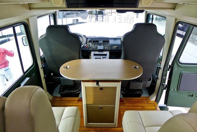越野房車內(nèi)飾:可以看到,柚木地板外加兩個電動座椅與一個帶儲藏柜的可移動多功能桌構(gòu)成了這輛越野房車的第二排。除此之外,頭頂上方安置有26寸索尼液晶電視和帶衛(wèi)星電視機頂盒的藍光播放器,微波爐烤箱、小型冰箱、電磁爐等常用設備也是一應俱全,當然恒溫式的出水系統(tǒng)以及真空馬桶、獨立淋浴也是一樣不少。具備天窗和側(cè)窗的尾箱處安置有兩張舒適的標準床鋪,可以說盡管這輛U5000并非加長特裝版,但所有居住設備都很齊全。