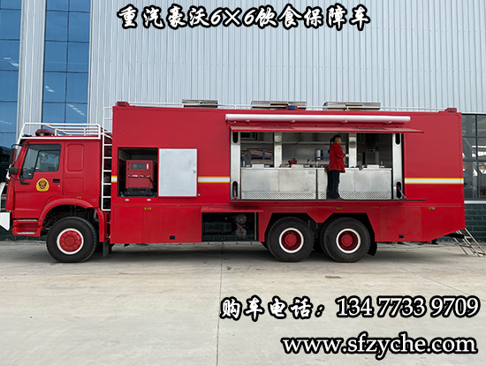 重汽豪沃6×6消防飲食保障車是根據(jù)公安,武警,消防,林業(yè)局,地質(zhì)勘探,水利水電,公路搶險等部門野外執(zhí)行任務(wù)的需要,為提高后勤保障能力,改善野外生存條件而研制的一種新型野外自行式炊事車,特別適應(yīng)快速反應(yīng)部隊執(zhí)行任務(wù)的需要。該車采用重汽豪沃六驅(qū)底盤,車廂為隔熱保溫大板粘接式輕型結(jié)構(gòu),多種供電方式為車內(nèi)各用電設(shè)備提供電源。車內(nèi)配有高效的封閉式燃油節(jié)能爐灶、配套設(shè)備、各種廚具等。本車具有操作方便、使用可靠、熱效率高,保溫效果好等特點,適應(yīng)全天候展收作業(yè),是先進(jìn)的后勤裝備?稍谝恍r內(nèi)供應(yīng)150人的主副食及開水。備注:據(jù)用戶需求,整車對底盤進(jìn)行改裝,設(shè)有8-13Kw駐車自發(fā)電系統(tǒng),1.5Kw行車發(fā)電系統(tǒng),以及配電系統(tǒng),主副食控制系統(tǒng),作業(yè)監(jiān)控系統(tǒng),水路系統(tǒng),油路系統(tǒng), 附件及工具。